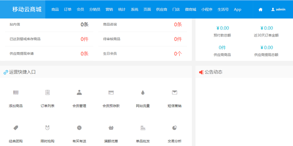 6、后臺支持(chi)系(xi)統(tong)包含(han)商品管(guan)(guan)理(li)、訂單管(guan)(guan)理(li)、會員管(guan)(guan)理(li)、分(fen)銷(xiao)員管(guan)(guan)理(li)、營(ying)銷(xiao)中心、統(tong)計分(fen)析、基本設(she)置(zhi)、頁(ye)面(mian)管(guan)(guan)理(li)、供(gong)應商管(guan)(guan)理(li)、門店管(guan)(guan)理(li)、微商城(cheng)管(guan)(guan)理(li)、小(xiao)程序管(guan)(guan)理(li)、生(sheng)活號設(she)置(zhi)等模塊。