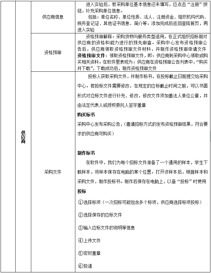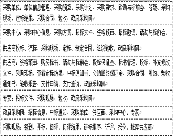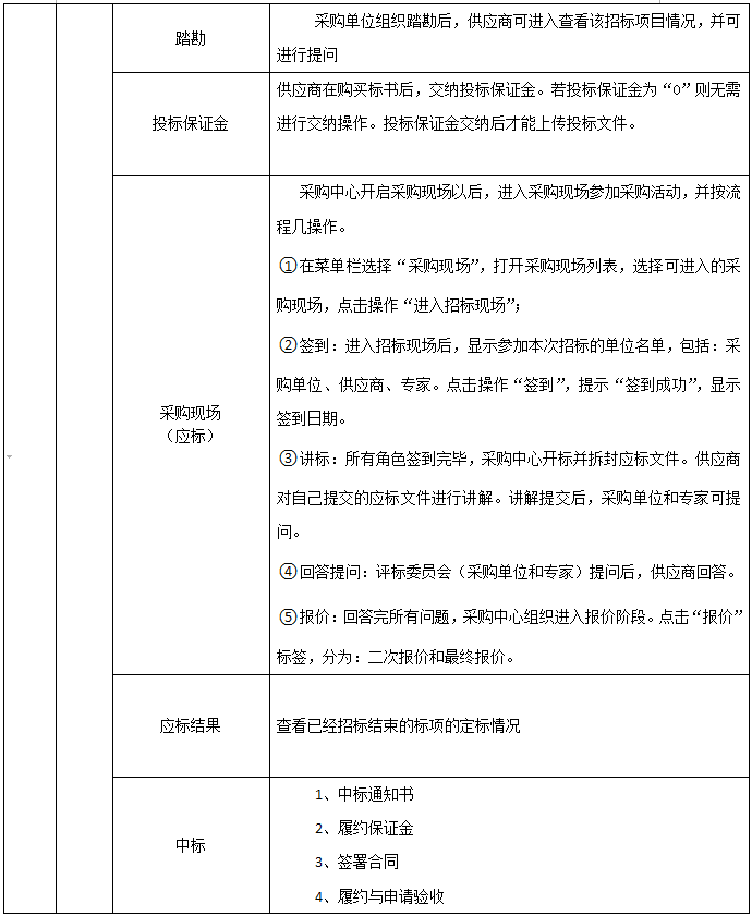 供應(ying)商信息、資格預(yu)審、采(cai)購文件、踏勘、投標(biao)(biao)保證(zheng)金(jin)、采(cai)購現場(應(ying)標(biao)(biao))、應(ying)標(biao)(biao)結(jie)果、中標(biao)(biao)、驗(yan)收、支付(fu)