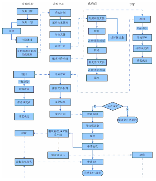 4、采(cai)(cai)購(gou)(gou)活動(dong)由(you)采(cai)(cai)購(gou)(gou)單位發起,根據采(cai)(cai)購(gou)(gou)目(mu)錄制定采(cai)(cai)購(gou)(gou)預算、采(cai)(cai)購(gou)(gou)計劃(hua)、采(cai)(cai)購(gou)(gou)需求建(jian)立采(cai)(cai)購(gou)(gou)任務(wu)。由(you)采(cai)(cai)購(gou)(gou)中心組織并發布采(cai)(cai)購(gou)(gou)信息(xi),供(gong)應商通過采(cai)(cai)購(gou)(gou)信息(xi)前來購(gou)(gou)買標(biao)書(shu)、制作采(cai)(cai)購(gou)(gou)響應文件、投遞(di)標(biao)書(shu)、交納保證金、參加標(biao)前會和踏勘、開標(biao)前提交質疑文件