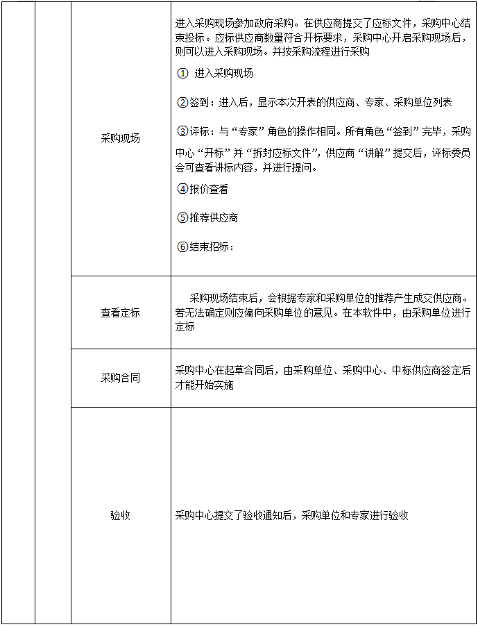采(cai)(cai)購(gou)中心信息、制定采(cai)(cai)購(gou)方案(an)、采(cai)(cai)購(gou)方案(an)管理(li)制定招(zhao)(zhao)標(biao)(biao)文件、資(zi)格預審(邀請(qing)招(zhao)(zhao)標(biao)(biao))、投標(biao)(biao)邀請(qing)、邀請(qing)招(zhao)(zhao)標(biao)(biao)&單一來源、招(zhao)(zhao)標(biao)(biao)公告、踏(ta)勘與(yu)標(biao)(biao)前會、查看(kan)供應商投標(biao)(biao)、(結(jie)束(shu)投標(biao)(biao))查看(kan)流標(biao)(biao)、采(cai)(cai)購(gou)現(xian)場、定標(biao)(biao)、制定合同、組織驗收(shou)