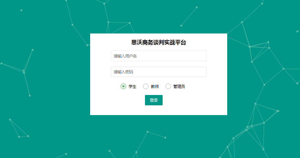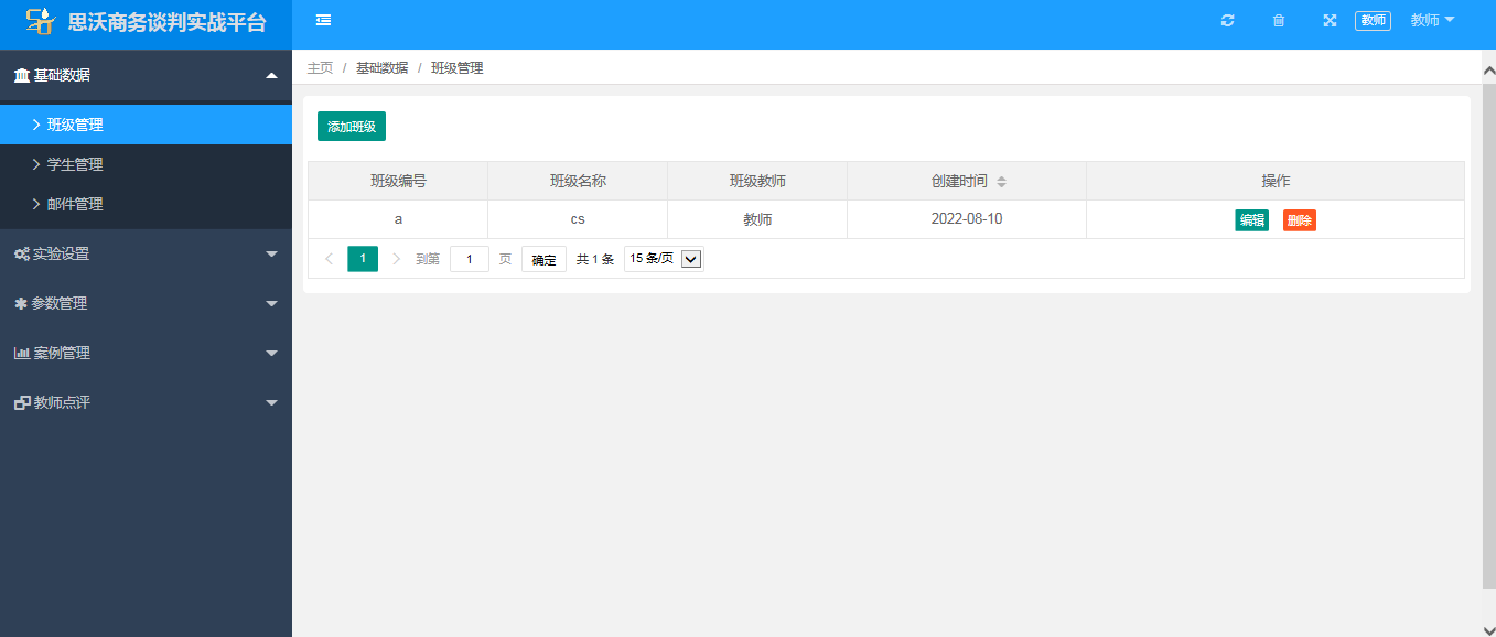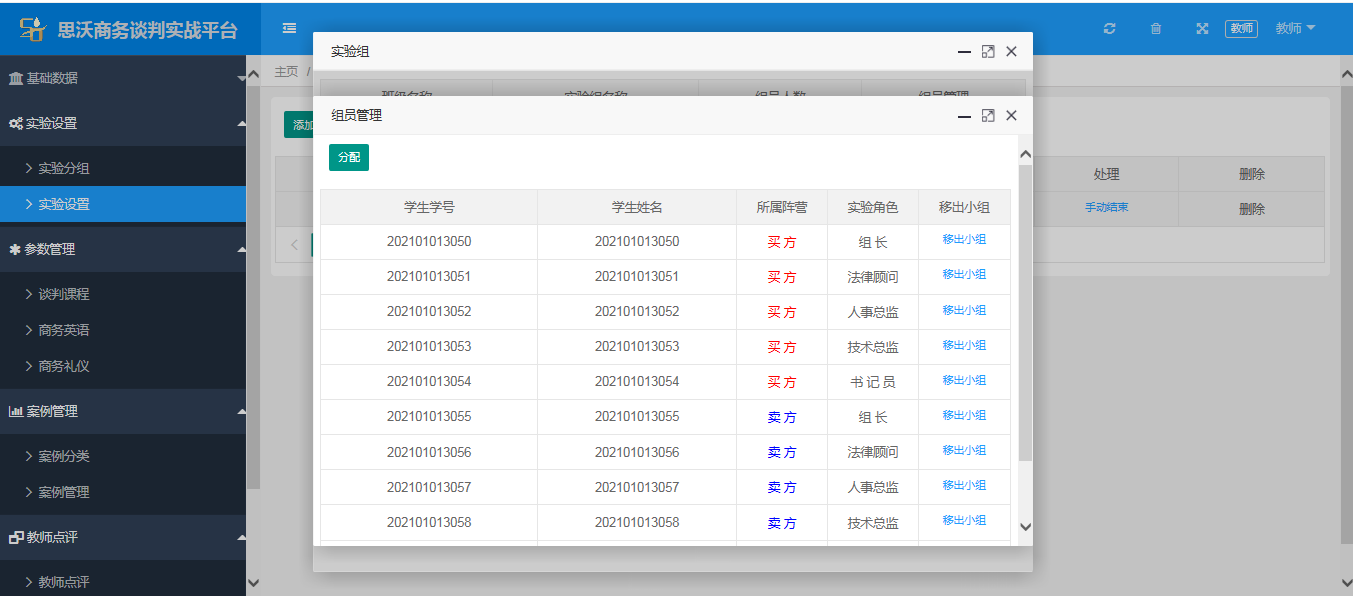 教師(shi)端包(bao)括(kuo):基礎數(shu)據(班級(ji)管(guan)(guan)理、學(xue)生管(guan)(guan)理、郵件(jian)管(guan)(guan)理);實(shi)(shi)驗(yan)設(she)置(實(shi)(shi)驗(yan)分(fen)組、實(shi)(shi)驗(yan)設(she)置);參數(shu)管(guan)(guan)理(談判(pan)課(ke)程、商務(wu)(wu)英語、商務(wu)(wu)禮(li)儀);案(an)例管(guan)(guan)理(案(an)例分(fen)類(lei)、案(an)例管(guan)(guan)理);教師(shi)點評(教師(shi)點評、教師(shi)點評庫(ku)、視頻回放、談判(pan)得分(fen))。
