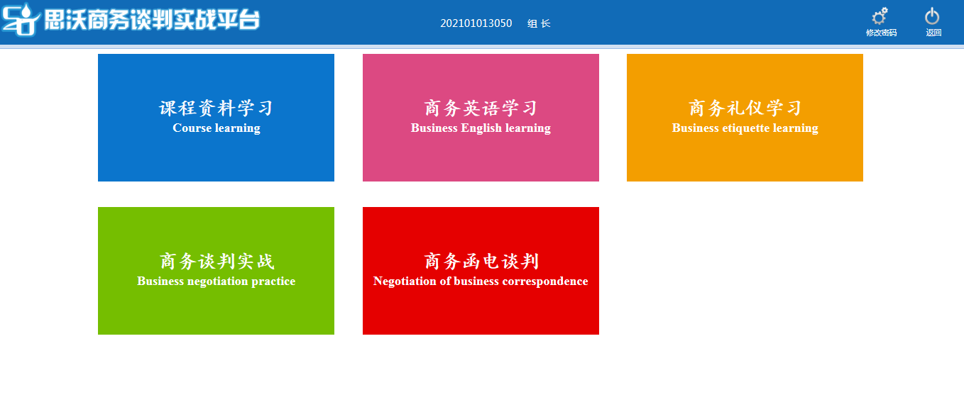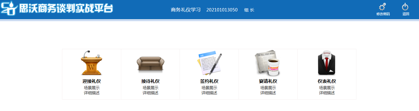 思沃國(guo)際(ji)商務談判(pan)實(shi)訓平臺系統采用(yong)了源(yuan)于國(guo)外知名商學院的(de)商務談判(pan)經(jing)典案例素材(cai),結(jie)合(he)近10年來應(ying)用(yong)于中國(guo)學生的(de)教學實(shi)踐(jian)經(jing)驗(yan)加以修訂和完善,形成了與教學課件內容(rong)和進程(cheng)相配合(he)的(de)7個模擬談判(pan)實(shi)踐(jian)單元。