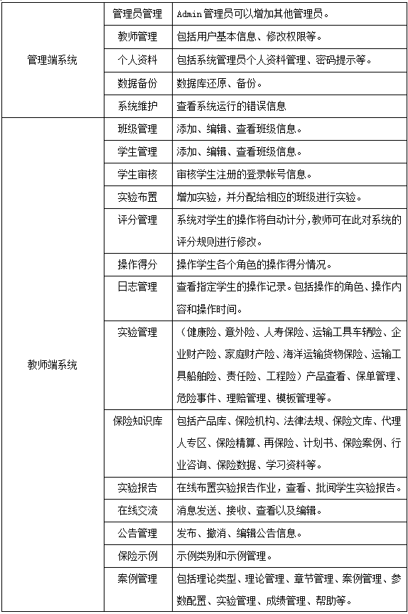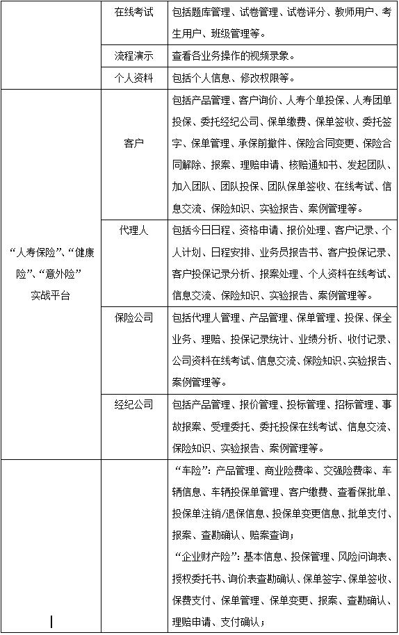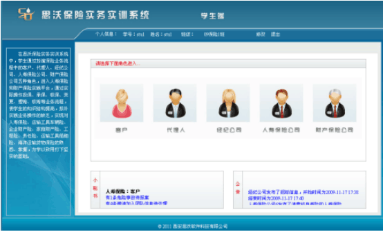 學生通(tong)過飾演(yan)保(bao)(bao)險(xian)(xian)(xian)(xian)(xian)業(ye)務(wu)流程中(zhong)(zhong)的(de)(de)(de)客戶、代理人(ren)、經紀公司(si)、人(ren)壽保(bao)(bao)險(xian)(xian)(xian)(xian)(xian)公司(si)、財產(chan)保(bao)(bao)險(xian)(xian)(xian)(xian)(xian)公司(si)五(wu)種角色,進(jin)入“人(ren)壽保(bao)(bao)險(xian)(xian)(xian)(xian)(xian)”和(he)“財產(chan)保(bao)(bao)險(xian)(xian)(xian)(xian)(xian)”實踐平臺(tai),從展(zhan)業(ye)投(tou)(tou)保(bao)(bao)環節開始(shi),至索賠(pei)(pei)理賠(pei)(pei)為止,全面操(cao)練保(bao)(bao)險(xian)(xian)(xian)(xian)(xian)核(he)心業(ye)務(wu)中(zhong)(zhong)的(de)(de)(de)投(tou)(tou)保(bao)(bao)、承保(bao)(bao)、核(he)保(bao)(bao)、變(bian)更、理賠(pei)(pei)、核(he)賠(pei)(pei)等流程,使學生的(de)(de)(de)知識結構提升(sheng),彌補實踐業(ye)務(wu)操(cao)作的(de)(de)(de)缺乏,實現(xian)對人(ren)壽保(bao)(bao)險(xian)(xian)(xian)(xian)(xian)、運輸工(gong)具車(che)輛險(xian)(xian)(xian)(xian)(xian)、企業(ye)財產(chan)險(xian)(xian)(xian)(xian)(xian)、家庭財產(chan)險(xian)(xian)(xian)(xian)(xian)、海洋運輸貨物保(bao)(bao)險(xian)(xian)(xian)(xian)(xian)、運輸工(gong)具船舶險(xian)(xian)(xian)(xian)(xian)、責任險(xian)(xian)(xian)(xian)(xian)、工(gong)程險(xian)(xian)(xian)(xian)(xian)的(de)(de)(de)熟悉、掌握(wo),對保(bao)(bao)險(xian)(xian)(xian)(xian)(xian)業(ye)務(wu)的(de)(de)(de)主要工(gong)作流程有一個清晰的(de)(de)(de)輪廓,為學以致用打下堅固的(de)(de)(de)基礎。