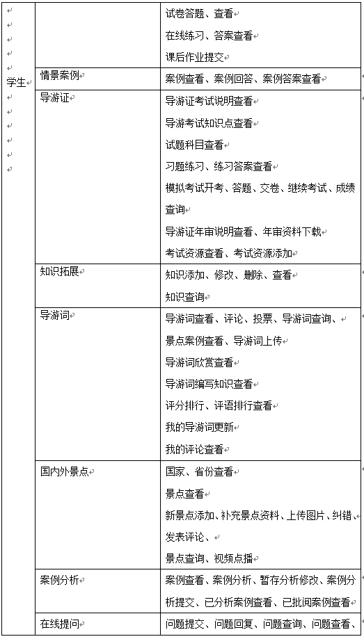 教師主要功能包括班(ban)級學生(sheng)管(guan)理(li)、導(dao)(dao)(dao)游(you)(you)基礎知(zhi)識(shi)管(guan)理(li)、國內導(dao)(dao)(dao)游(you)(you)知(zhi)識(shi)管(guan)理(li)、國外導(dao)(dao)(dao)游(you)(you)知(zhi)識(shi)管(guan)理(li)、情景(jing)題(ti)目管(guan)理(li)、導(dao)(dao)(dao)游(you)(you)證考(kao)試資料(liao)管(guan)理(li)、模擬考(kao)試、導(dao)(dao)(dao)游(you)(you)詞管(guan)理(li)、導(dao)(dao)(dao)游(you)(you)案例管(guan)理(li)、知(zhi)識(shi)拓(tuo)展(zhan)、案例分(fen)析管(guan)理(li)、在線問(wen)答(da)、國內外景(jing)點信息管(guan)理(li)等。