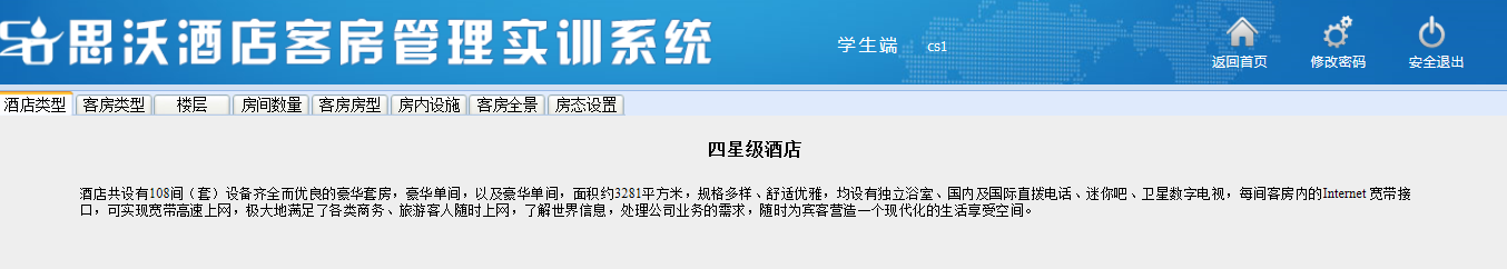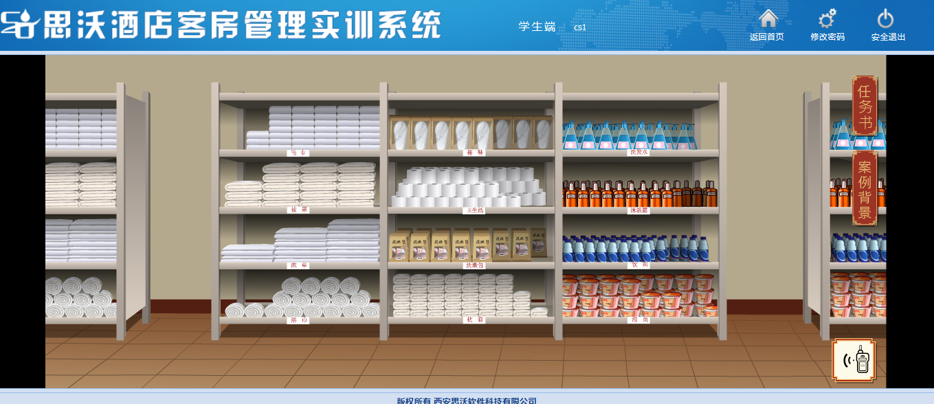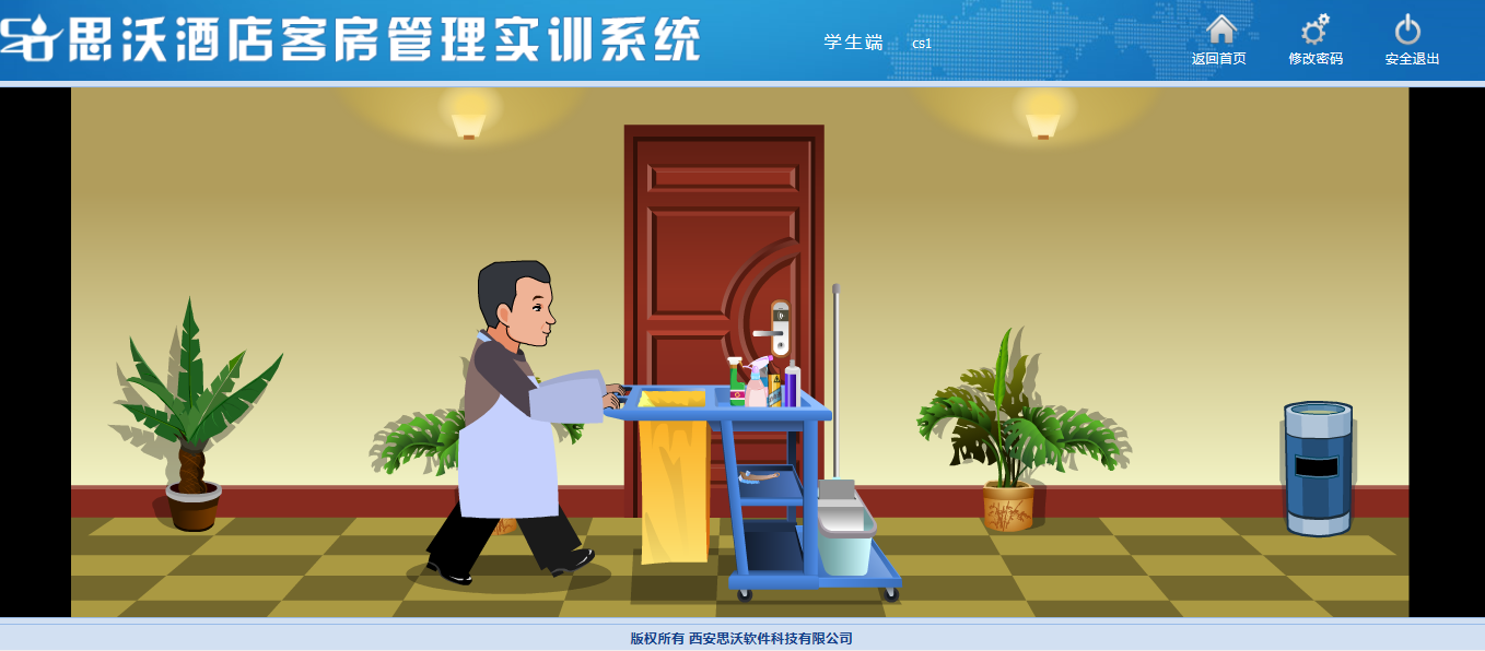 思沃(wo)酒(jiu)店(dian)客(ke)房(fang)(fang)(fang)(fang)管(guan)理(li)模擬(ni)實(shi)訓系統以flash動畫(hua)模擬(ni)酒(jiu)店(dian)情景(jing),學(xue)生進入(ru)進行(xing)模擬(ni)客(ke)房(fang)(fang)(fang)(fang)管(guan)理(li)日常(chang)事(shi)務處理(li),包括客(ke)房(fang)(fang)(fang)(fang)設計、引領入(ru)住(zhu)、客(ke)房(fang)(fang)(fang)(fang)查房(fang)(fang)(fang)(fang)、客(ke)房(fang)(fang)(fang)(fang)整理(li)、布草間等類(lei)型實(shi)訓。