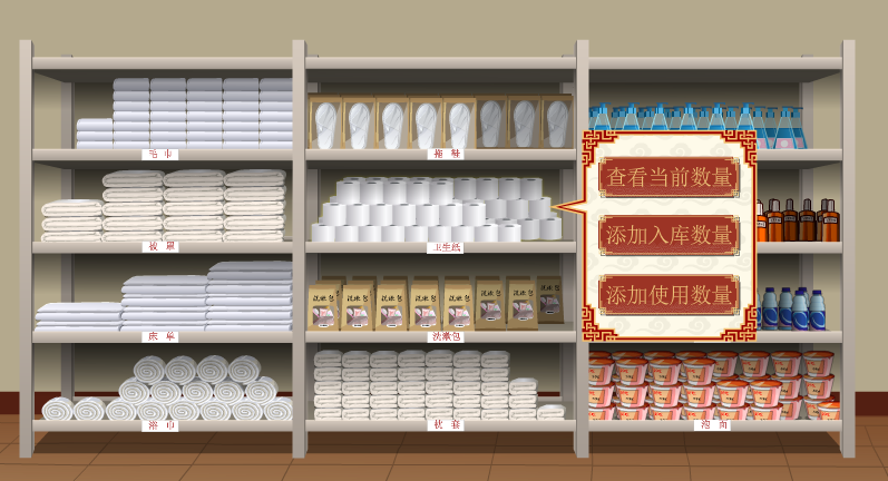 學生(sheng)模擬工作人(ren)員通過動(dong)畫場景互(hu)動(dong)對布(bu)草間進(jin)行管理操作。并可查看床單(dan)、被罩、枕套、浴巾(jin)(jin)、毛巾(jin)(jin)、洗漱包(bao)、洗發水等消(xiao)耗物品的庫存數(shu)量(liang),并判斷是否補充(chong)。