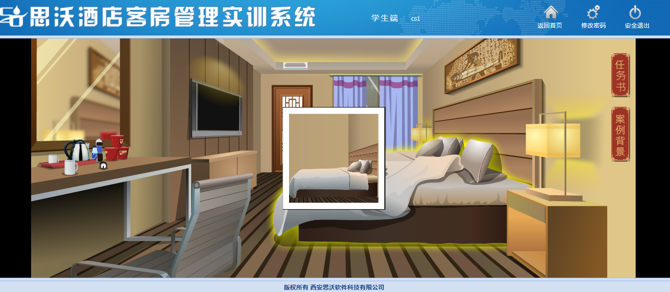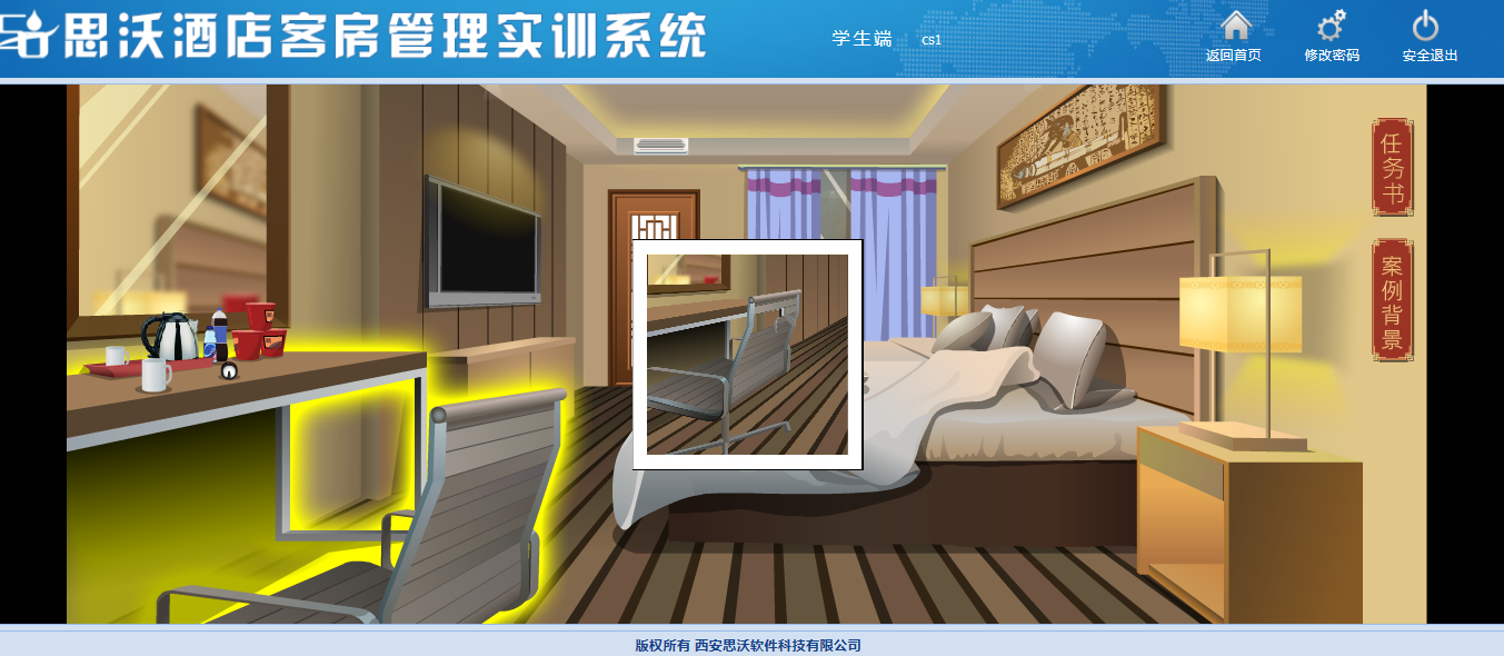 該(gai)教學(xue)軟件(jian)平臺(tai)模(mo)擬客房(fang)場(chang)景,學(xue)生通過場(chang)景互動進行模(mo)擬操作(zuo),包含任務書、案(an)例背景等,學(xue)生在操作(zuo)過程(cheng)中(zhong)(zhong)可(ke)隨時查看進度(du)。學(xue)生通過該(gai)教學(xue)軟件(jian)平臺(tai)的虛擬場(chang)景中(zhong)(zhong)可(ke)對床上(shang)用品、窗簾(lian)、電(dian)器(qi)、桌椅(yi)、茶幾上(shang)的消費商品、洗漱臺(tai)、馬桶、浴室等進行整理操作(zuo)。