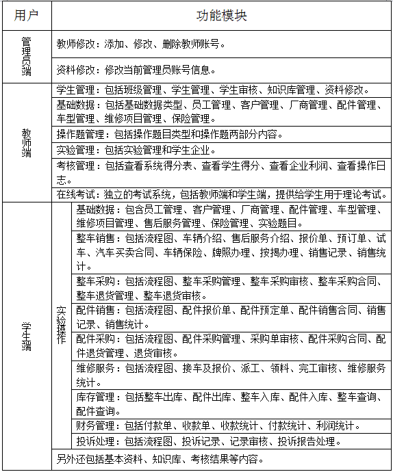 系統分為三個權限端(duan)口,管(guan)(guan)理(li)(li)員(yuan)端(duan)、教師(shi)端(duan)和學生(sheng)(sheng)端(duan)。教師(shi)除對(dui)(dui)學生(sheng)(sheng)、班(ban)級進行管(guan)(guan)理(li)(li)外(wai),對(dui)(dui)實(shi)驗(yan)的管(guan)(guan)理(li)(li)尤為重要。不僅可以設置實(shi)驗(yan)基(ji)礎數據,包括(kuo)員(yuan)工管(guan)(guan)理(li)(li)、客戶管(guan)(guan)理(li)(li)、廠商(shang)管(guan)(guan)理(li)(li)、配件管(guan)(guan)理(li)(li)、車型(xing)管(guan)(guan)理(li)(li)、維修(xiu)項目管(guan)(guan)理(li)(li)、保險管(guan)(guan)理(li)(li)等(deng)。還可以對(dui)(dui)實(shi)驗(yan)狀態進行控制。系統記(ji)錄學生(sheng)(sheng)操(cao)作得分、企(qi)業利(li)潤(run)、操(cao)作日志等(deng),便于教師(shi)更好的進行教學安(an)排。