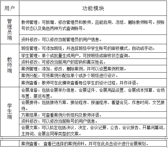 根據每個案(an)例信息,系統(tong)細分會(hui)(hui)(hui)展(zhan)(zhan)策劃過程,將(jiang)展(zhan)(zhan)覽會(hui)(hui)(hui)名稱、活(huo)動(dong)背景(jing)、活(huo)動(dong)目的意(yi)義、會(hui)(hui)(hui)展(zhan)(zhan)具體展(zhan)(zhan)示部分以及(ji)或中中需要注意(yi)的問題融入(ru)到整個實(shi)訓系統(tong)中。會(hui)(hui)(hui)展(zhan)(zhan)策劃軟件將(jiang)突(tu)出會(hui)(hui)(hui)展(zhan)(zhan)舉辦信息、會(hui)(hui)(hui)展(zhan)(zhan)證件、會(hui)(hui)(hui)展(zhan)(zhan)用品設置(zhi)、會(hui)(hui)(hui)展(zhan)(zhan)成本預算(suan)、會(hui)(hui)(hui)場布置(zhi)、展(zhan)(zhan)覽布置(zhi)、接(jie)待方案(an)、接(jie)站程序、報到程序、看(kan)望會(hui)(hui)(hui)見(jian)、作息時間(jian)、文藝接(jie)待等項目。