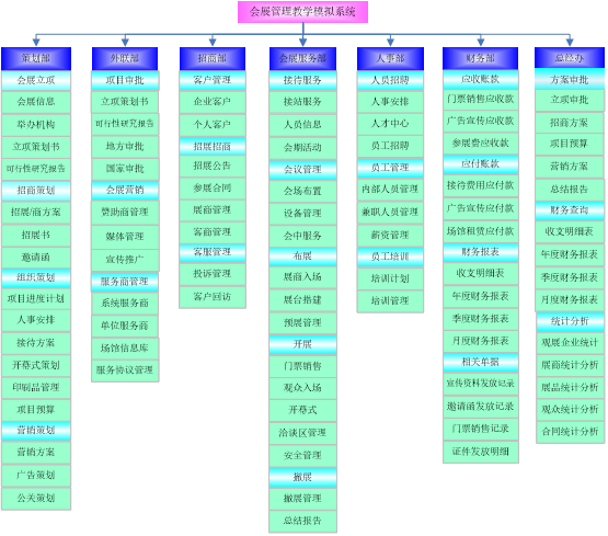 思沃會(hui)展(zhan)營銷模擬實(shi)訓系(xi)統以模擬會(hui)展(zhan)公司的(de)(de)(de)策劃部(bu)(bu)(bu)(bu)、外聯(lian)部(bu)(bu)(bu)(bu)、招商部(bu)(bu)(bu)(bu)、會(hui)展(zhan)服務(wu)(wu)部(bu)(bu)(bu)(bu)、人(ren)事部(bu)(bu)(bu)(bu)、財務(wu)(wu)部(bu)(bu)(bu)(bu)以及總經辦7大業(ye)務(wu)(wu)部(bu)(bu)(bu)(bu)門為基礎而展(zhan)開(kai)實(shi)驗操作(zuo)(zuo)(zuo)的(de)(de)(de)。該教學(xue)平臺(tai)軟件(jian)業(ye)務(wu)(wu)內容(rong)(rong)包括了:項目上報審(shen)批、項目的(de)(de)(de)策劃安排、服務(wu)(wu)商管(guan)理(li)(li)(li)、人(ren)事招聘(pin)與(yu)(yu)(yu)管(guan)理(li)(li)(li)、會(hui)展(zhan)的(de)(de)(de)現(xian)場(chang)服務(wu)(wu)與(yu)(yu)(yu)合同管(guan)理(li)(li)(li)等(deng)等(deng),讓學(xue)生(sheng)通過實(shi)驗感受會(hui)展(zhan)項目的(de)(de)(de)系(xi)統化管(guan)理(li)(li)(li)流程與(yu)(yu)(yu)業(ye)務(wu)(wu)操作(zuo)(zuo)(zuo)內容(rong)(rong),不(bu)但能夠了解會(hui)展(zhan)項目從立項審(shen)批到策劃、宣(xuan)傳、招展(zhan)招商、現(xian)場(chang)服務(wu)(wu)以及會(hui)后(hou)總結各個環節的(de)(de)(de)業(ye)務(wu)(wu),同時還(huan)可(ke)以掌握各種文案的(de)(de)(de)寫作(zuo)(zuo)(zuo)技巧,從而讓學(xue)生(sheng)真(zhen)正的(de)(de)(de)理(li)(li)(li)解并掌握會(hui)展(zhan)這一行業(ye)的(de)(de)(de)各種知識(shi)與(yu)(yu)(yu)業(ye)務(wu)(wu)要求(qiu)。為學(xue)生(sheng)以后(hou)的(de)(de)(de)工作(zuo)(zuo)(zuo)、學(xue)習提(ti)供了一個實(shi)戰演練的(de)(de)(de)實(shi)訓平臺(tai),增強了學(xue)生(sheng)進入工作(zuo)(zuo)(zuo)崗位(wei)后(hou)的(de)(de)(de)實(shi)力(li)。