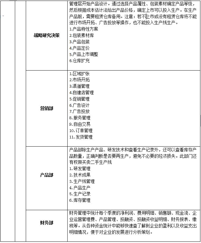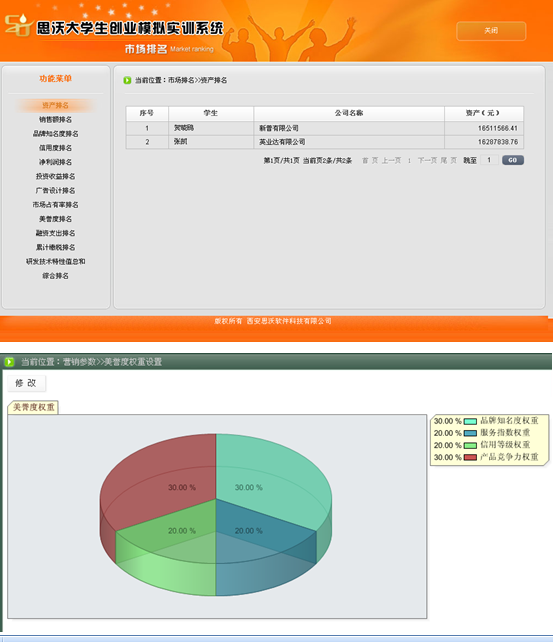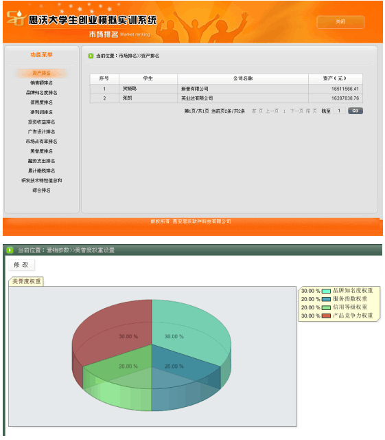 5、系統具有自(zi)(zi)動計分(fen)和(he)手(shou)動評分(fen)功能。自(zi)(zi)動計分(fen)以各(ge)方(fang)面排(pai)(pai)名(ming)(ming)(ming)的形式,包括資(zi)金(jin)排(pai)(pai)名(ming)(ming)(ming)、銷(xiao)售(shou)排(pai)(pai)名(ming)(ming)(ming)、知(zhi)名(ming)(ming)(ming)度排(pai)(pai)名(ming)(ming)(ming)、利潤排(pai)(pai)名(ming)(ming)(ming)、投(tou)(tou)資(zi)收益(yi)排(pai)(pai)名(ming)(ming)(ming)、廣告(gao)設計排(pai)(pai)名(ming)(ming)(ming)、市(shi)場占有率排(pai)(pai)名(ming)(ming)(ming)、美譽(yu)度排(pai)(pai)名(ming)(ming)(ming)、投(tou)(tou)融資(zi)收益(yi)排(pai)(pai)名(ming)(ming)(ming)、累計繳稅排(pai)(pai)名(ming)(ming)(ming)、綜合排(pai)(pai)名(ming)(ming)(ming)等。教師(shi)可以批閱(yue)學生所提交的計劃書、廣告(gao)設計、市(shi)場調查分(fen)析、公司制度等。