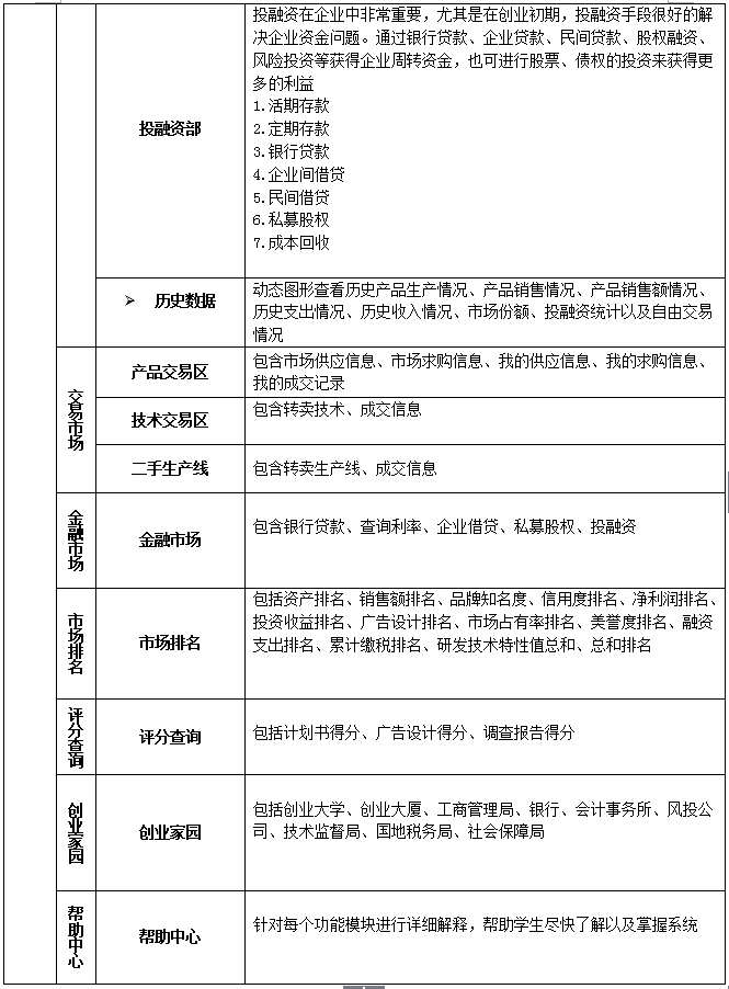 4、企業投(tou)(tou)(tou)(tou)融資(zi)管(guan)理:系統(tong)必須含(han)有(you)投(tou)(tou)(tou)(tou)融資(zi)模(mo)塊(kuai),了解操作企業的基本投(tou)(tou)(tou)(tou)資(zi)和融資(zi)手(shou)段,模(mo)塊(kuai)包(bao)括:銀行(xing)(xing)存(cun)款、銀行(xing)(xing)貸(dai)款、企業間借(jie)貸(dai)、民間借(jie)貸(dai)、私幕股權。另外還含(han)有(you)風(feng)(feng)(feng)險(xian)投(tou)(tou)(tou)(tou)資(zi)模(mo)塊(kuai),在(zai)審核(he)計劃書(shu)后做(zuo)出評(ping)價和評(ping)分,由教師設(she)置(zhi)是否給(gei)予風(feng)(feng)(feng)險(xian)投(tou)(tou)(tou)(tou)資(zi),以及(ji)金額。設(she)置(zhi)后系統(tong)自動給(gei)相(xiang)應企業發送反饋信(xin)息,接受并給(gei)予風(feng)(feng)(feng)投(tou)(tou)(tou)(tou)的企業前來簽(qian)訂(ding)風(feng)(feng)(feng)投(tou)(tou)(tou)(tou)協議領取(qu)風(feng)(feng)(feng)投(tou)(tou)(tou)(tou)資(zi)金